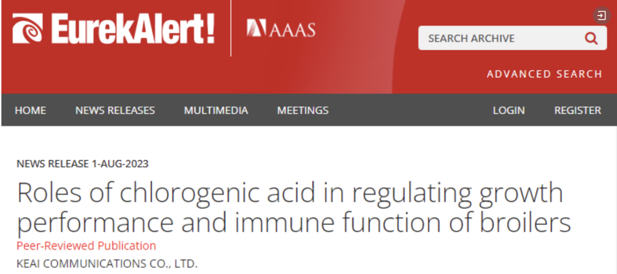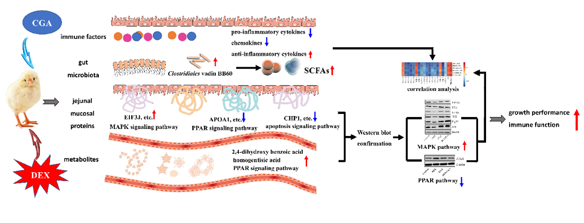 基于此,研究团队以地塞米松诱导的应激肉鸡为研究对象,通过检测生化指标,结合多组学技术,全面考察了绿原酸和植物乳杆菌P8在缓解肉鸡免疫应激和氧化中发挥的作用和机制。论文“Integrated multi-omics reveals the beneficial role of chlorogenic acid in improving the growth performance and immune function of immunologically stressed broilers”的结果表明,日粮中添加500 mg/kg绿原酸可以提高免疫应激肉鸡的生长性能、肠道屏障功能和免疫功能。通过使用微生物组学、代谢组学和蛋白质组学,发现绿原酸可通过增加肉鸡盲肠内容物中Clostridiales vadin BB60菌的丰度,提高肠道微生物代谢物(如2,4二羟基苯甲酸和尿黑酸)的水平以及调节肠道蛋白(如TMSB4X、LGMN和APOPA1)的表达量来改善肉鸡生长、肠道健康和免疫功能。美国科学促进会旗下科学新闻门户网站Eurekaler对该文进行了报道(https://www.eurekalert.org/news-releases/997443)。刘华伟教授和李雪敏硕士为该论文共同第一作者,王阳副教授和赵金山教授为共同通讯作者,青岛农业大学为唯一通讯单位。本研究得到青岛市科技计划项目和山东省自然科学基金项目的资助。